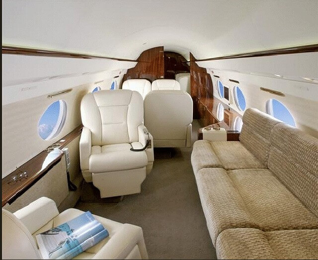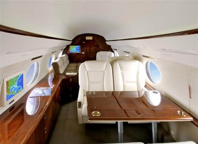 - Seating: Jet Flex cream leather seating, taupe Porta Bella fabric divans, forward 2-place club, mid-cabin 4-place conference group, dual aft individual club seats opposite 3-place berthable divan